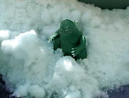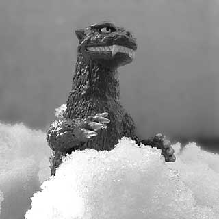 さて、じつは最近はビニパラの多くを箱に入れて押し入れの上の奥の方にしまい込んでいたので、キンゴジを引っ張り出すのは結構手間だったのです(ビリケンキンゴジの尻尾をはずすのとどっちが手間だったかはこの際考えない)。で、せっかく出したんだから他のソフビも使おうと想い、とりあえずキンゴジが氷山から出現することになった原因、「ゴジラの逆襲」でゴジラが雪に埋もれるシーンをやってみることにしました。・・・しかし崩れてくる様子もないし、逆襲ゴジラの顔もなんか楽しそう、ということで、埋まってくんだか出て来たんだかわからなくなってしまいました。それどころか雪遊びしてるようにさえ見えます。せめてモノクロにして、作品のイメージで見てもらおうという苦肉の策。 |