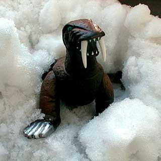 でまあ、ついでにもう一点。「妖星ゴラス」よりセイウチ型爬虫類という無茶な設定の怪獣「マグマ」の出現シーン。・・・ってのはなかったような気がしますねえ。で、ギニョールを使ったプレス用特写野イメージでいこうかと思って首を左に回してみたんですが、あれも改めて見ると雪も氷もない、仕方ないのでVTOLからの攻撃を受けるシーンのイメージで、俯瞰で撮ってみました。でもあのシーンも怪しいんだよなあ。雪あったかなあ。岩山だったような気もするしなあ。とにかく(^_^;)、昔は雪の名シーンがいっぱいあったのです。息子ゴジラのソフビがあれば「ゴジラの息子」のラスト、ミニラと抱き合って眠りにつくシーンなんか是非やりたいところ。・・・あ、でもミニラ持ってないや(^_^;)。息子ゴジラだって、もし出たからって買うかどうかわかんないなあ(^^;;;;; |